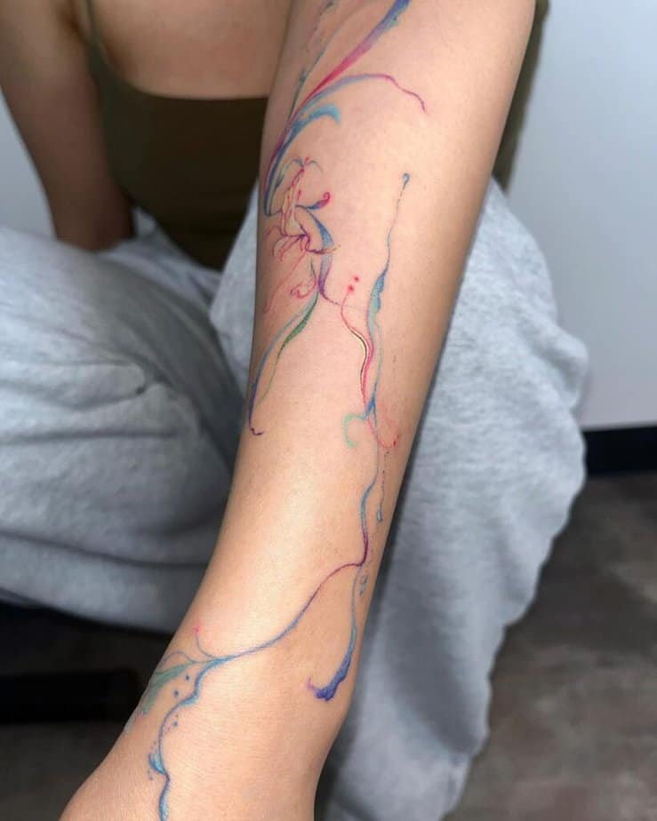 If you want something that reads more natural than geometric, splatter or ink-splash styles are perfect. They feel spontaneous, like someone flicked color onto your skin in a meaningful way. Collaborate with your artist to find the right balance between chaos and control so it looks effortless and intentional.