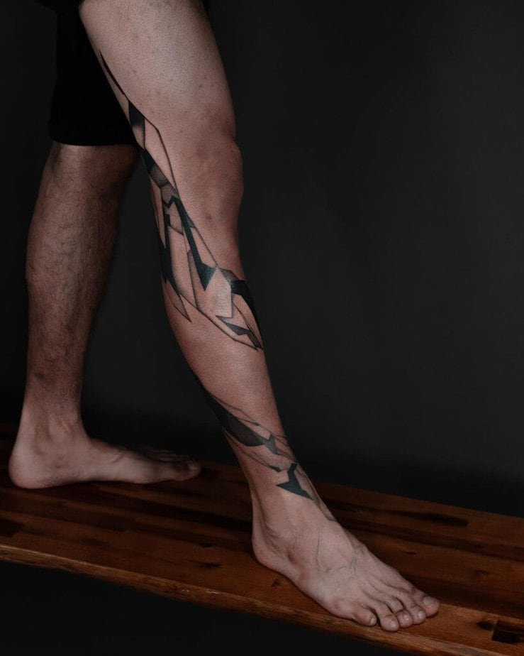 Geometric designs on the leg can read as strong and intentional. Depending on the shapes, they can feel more masculine, more architectural, or just sharply modern. They also wear well when the artist considers how the design sits over muscle.