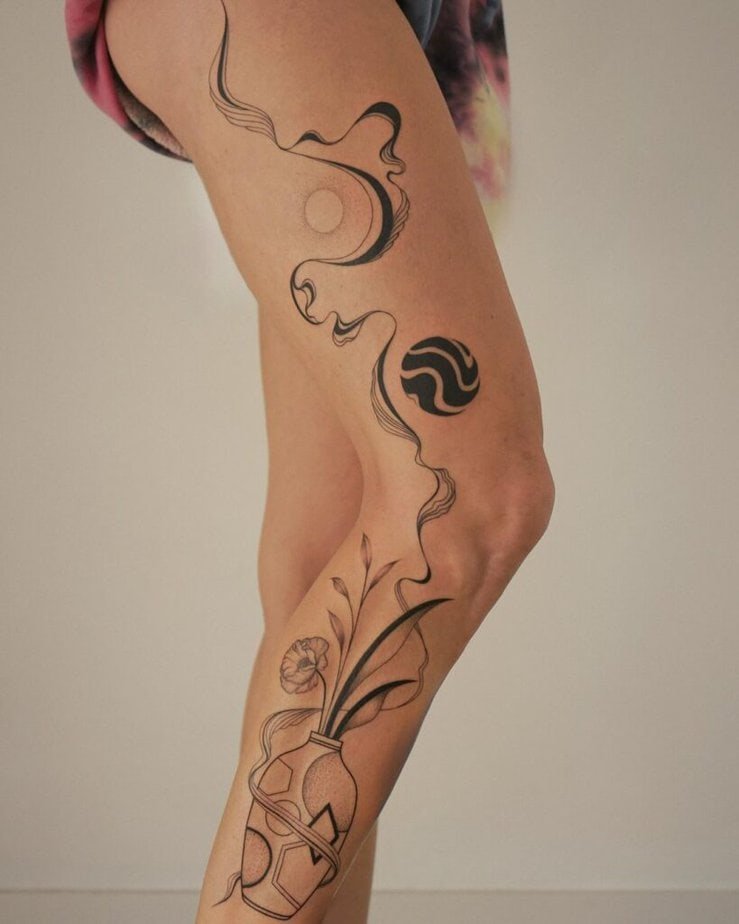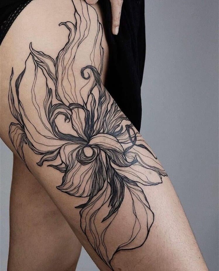 Floral lines that move and curl can read romantic, moody, or modern depending on how they’re done. In black, they feel graphic and strong; on the thigh, they stay yours to reveal. It’s the perfect mix of softness and attitude.