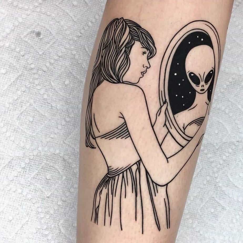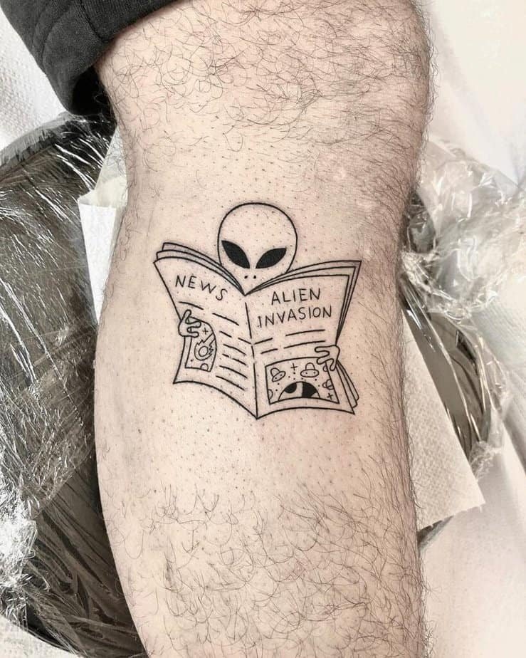 This one’s just fun and a little sarcastic — an alien casually reading the news like it’s no big deal. If you want a tattoo that makes people smile and roll their eyes in the best way, go for it.