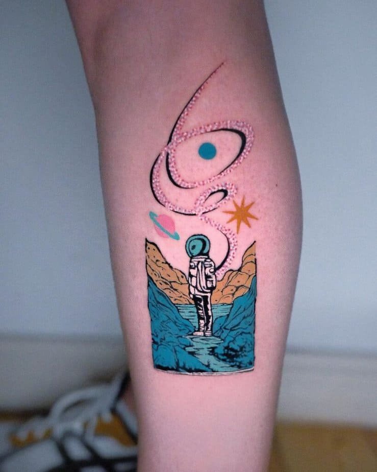 If you’re the type to think ‘why not?’ when planning a tattoo, this flashy, colorful alien is calling your name. You’re literally tattooing a being that doesn’t exist — so go full-on saturated color and have fun with it. It reads as art, personality, and a whole vibe.