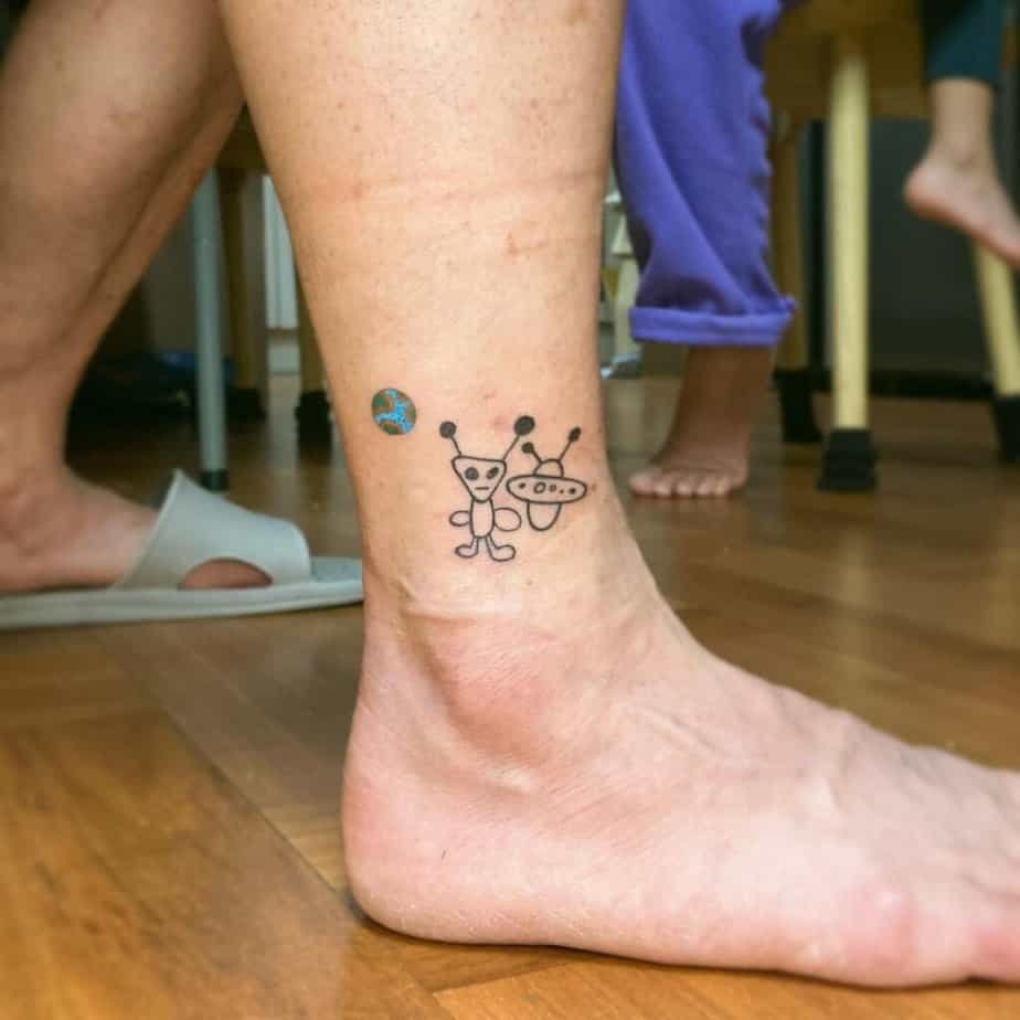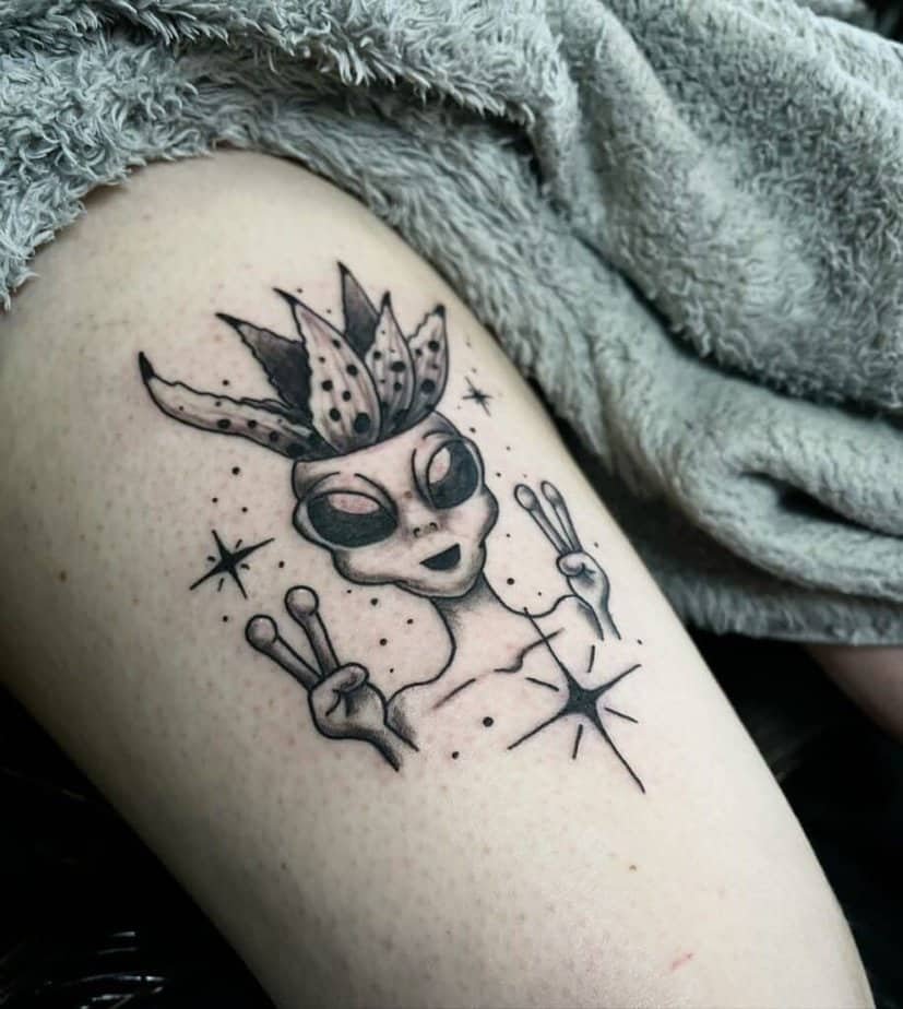 Sometimes less is more, and this fine-line alien with a tiny peace sign is proof. It’s minimal, gentle, and the little symbol gives it personality without being extra. If you like subtle tattoos that still start conversations, this one’s a quiet winner.
