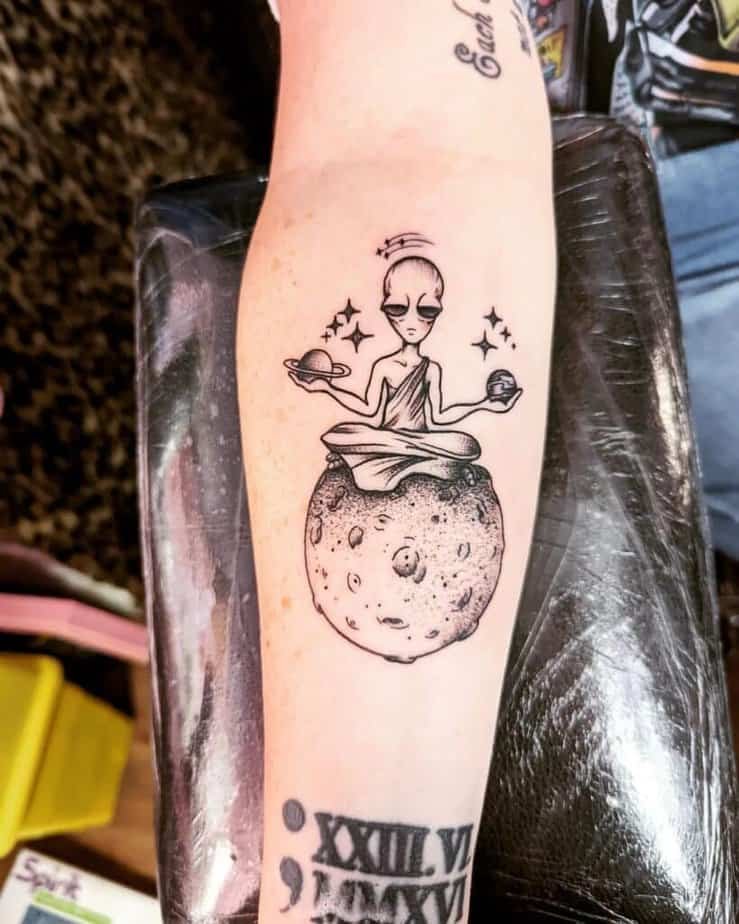 Instead of a yoga mat, this alien uses planets as props — which is honestly delightful. It blends humor with calm energy, so if you want a tattoo that’s part spiritual gag, this is it.