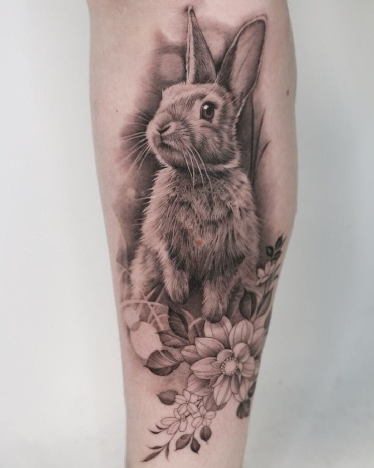Rabbits carry meanings like rebirth and luck, which is kind of lovely for a tattoo. You can keep it soft and minimal or go full naturalistic detail like the photo — either way it reads as gentle and hopeful.