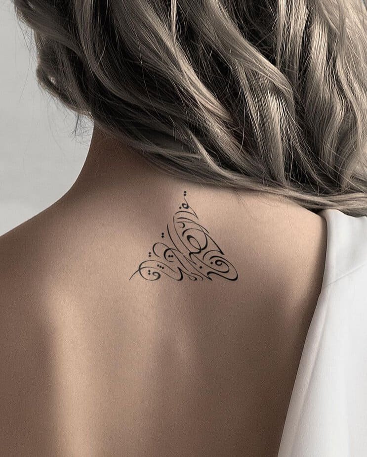 Between the shoulder blades, this triangular calligraphy piece feels alive — flowing and slightly whimsical. It’s unique without shouting for attention, and it’s the kind of tattoo that looks beautiful whether you catch a glimpse of it or keep it mostly hidden.