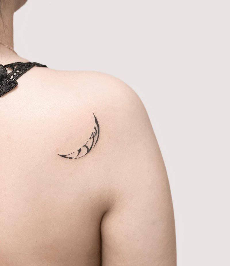 A crescent moon on the shoulder that has tiny words tucked inside — mysterious and poetic. It hints at inner growth and secret meanings, and it’s perfect if you like the idea of a tattoo that’s both symbolic and a little enigmatic.