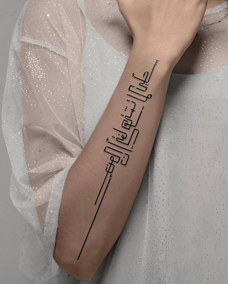 This one looks almost like fabric — calligraphy arranged into a blocky, woven design that covers part of the arm. It’s detailed and rhythmic, perfect for anyone who loves Arabic art and wants a tattoo that’s decorative and meaningful at once.