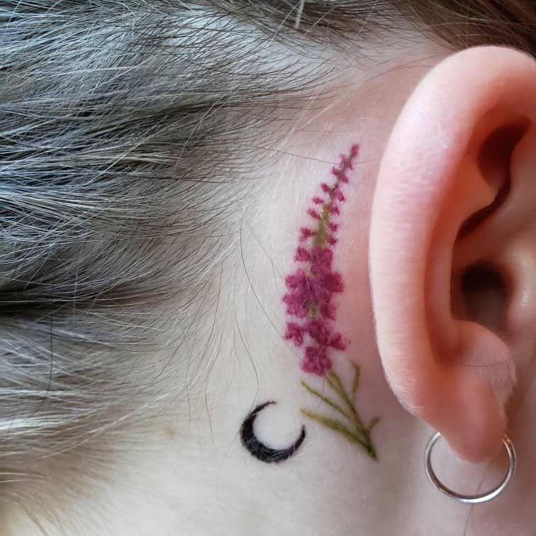 Okay, picture a tiny crescent moon wrapped in delicate roses, tucked right behind your ear like a little private garden. It’s soft and romantic and somehow both celestial and botanical — the kind of design that feels timeless and quietly joyful.