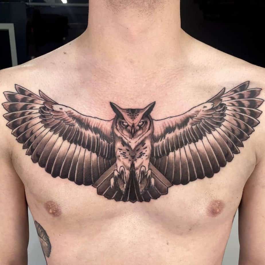 Owls are heavy with symbolism — wisdom, prosperity, good luck — and a detailed owl across the chest can look majestic. It’s a bold option if you want something with meaning and visual weight.