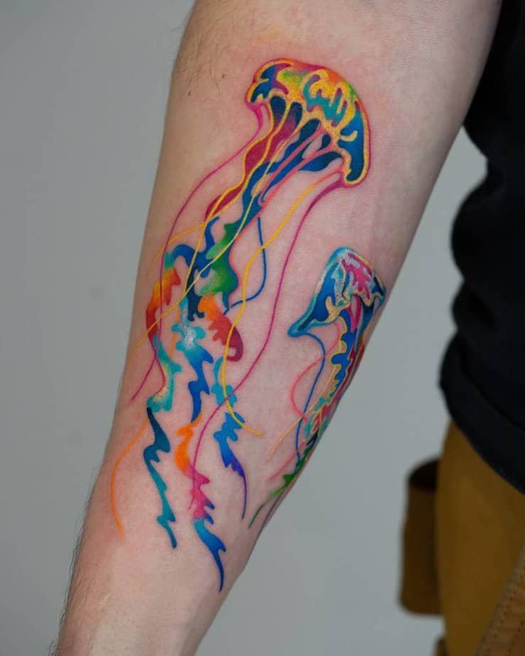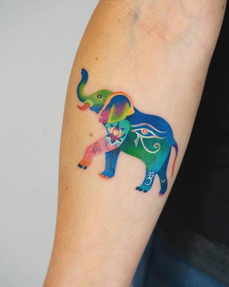 This forearm piece mixes a majestic elephant with vibrant colors, and there’s an eye drawn into its body and a lotus on the front leg. It’s the kind of tattoo that quietly says protection and good luck without being loud about it. The motifs fold together so smoothly it feels almost magical — like wearing a tiny story on your arm.