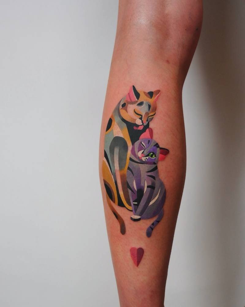 A mother cat watching over a kitten — the bigger one in yellow‑gray, the smaller one snuggling in gray and purple — this calf tattoo reads like unconditional love. It’s gentle, protective, and softly emotional.