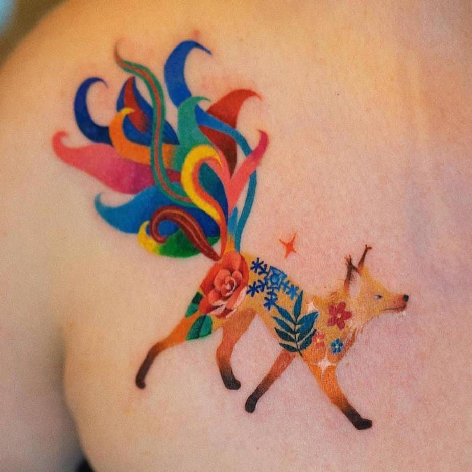 This piece reimagines the nine‑tailed fox from Chinese mythology with plants and flowers woven into its body and colorful tails that pop. It’s one of those tattoos that reads both ancient and fresh — myth wrapped in soft, modern color. Elegant, symbolic, and a little powerful all at once.