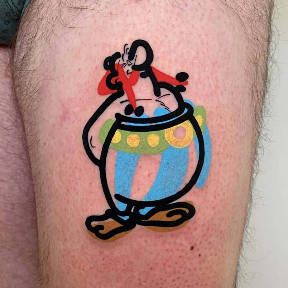 Obelix in all his striped glory makes for a playful thigh tattoo. He’s lovable, strong, and slightly goofy — the perfect nod to a character who’s been a joyful part of comic history for ages.