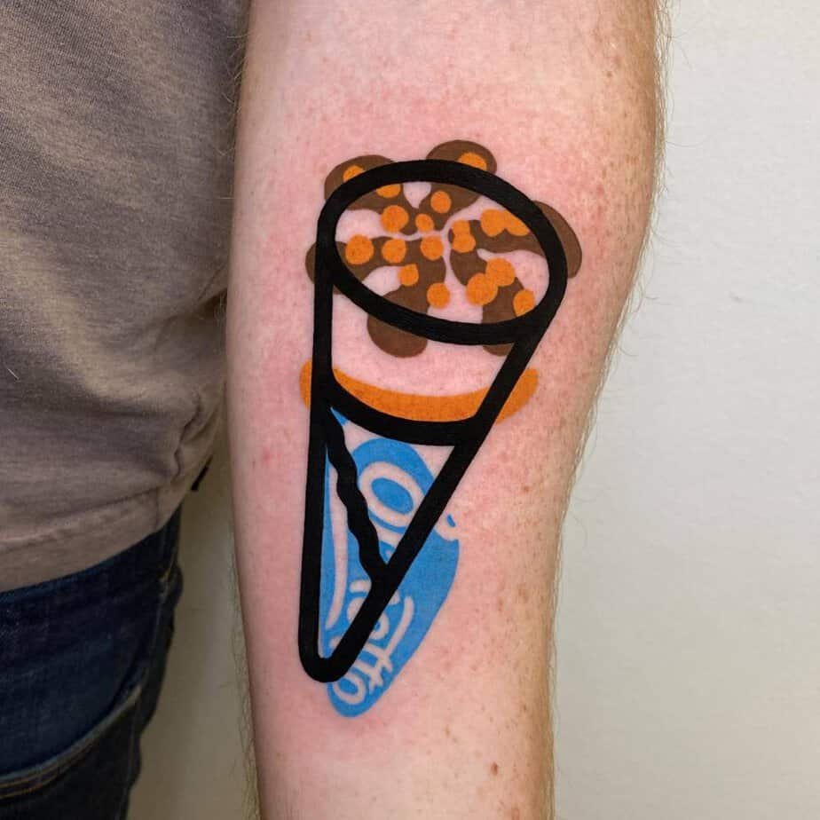 Outlined in black with colors that spill just a bit outside the lines, this ice‑cream tattoo is pure summer nostalgia. The blue cone and chocolate top make it feel fresh and fun — like a little, wearable scoop of joy.