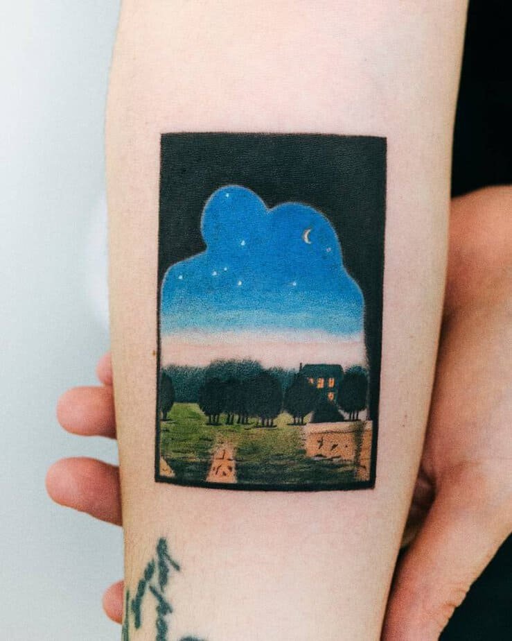 This one is dreamy: a nighttime sky and a house framed within the silhouette of two people hugging, all very Magritte. It feels like a little surreal moment tattooed right onto the skin, blending art history with something intensely personal.