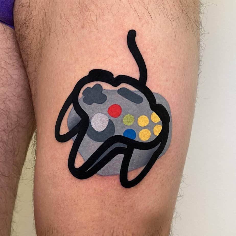 This leg tattoo is basically a love letter to simpler days: the N64 shape, the colorful buttons, all of it takes you back to running around with controllers and cereal. It’s cute and fun, but it’s also a gentle reminder of growing up — the small, golden parts of childhood that feel a little sweeter when you look back.