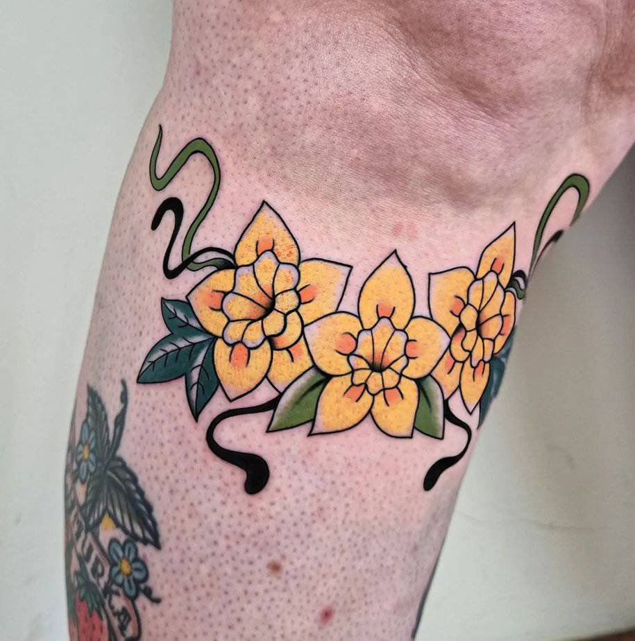 If you want something striking and a tiny bit daring, three daffodils on the knee in a classic tattoo palette demand attention. It’s colorful, confident, and full of personality — perfect for someone who likes to make a statement.