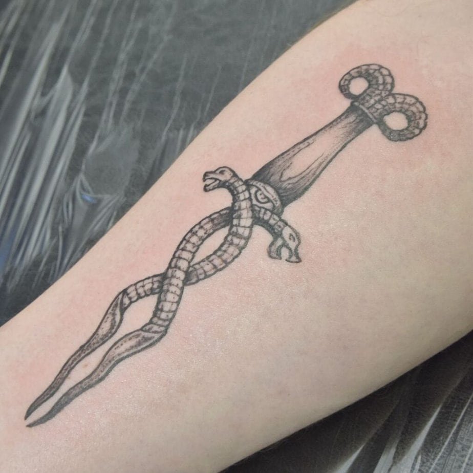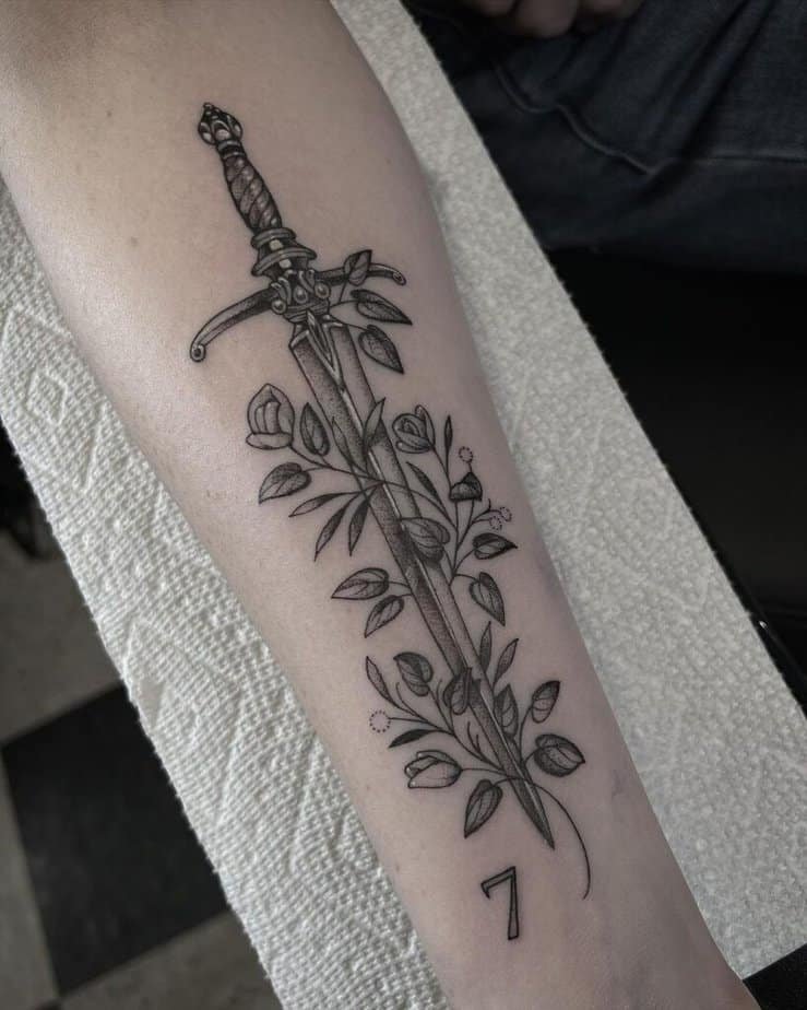 If you live for fantasy novels, these are the daggers that read like they were pulled from a heroine’s hip. Some need no color to feel magical—the detail and shading do the heavy lifting, and leaves around the blade give that forest-worn energy. Others are big and ornate, with handles so detailed you can imagine an artisan forging them in a hidden valley. A bejeweled dagger with a green gem feels regal; tiny dagger tattoos guarded by little roses feel like secret heirlooms. Then there are the darker ones, where the shading makes the blade look legitimately sinister—and blades with unusual shapes plus floral contrasts show you don’t have to choose between delicate and dangerous.