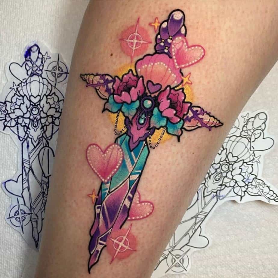 There’s a whole lane for daggers that feel feminine without being twee. One artist turned the handle into shells and flowers and made the blade look like crystal—little hearts and sparkles finish the fairy-tale vibe. If you want feminine but moody, there’s a design that’s mostly black ink but with tiny colorful details that read expensive and intentional. Another leans fully into pastel romance—purples, yellows, pinks, oranges—and it’s gorgeous. For the witchy folks, you’ve got a black snake curling down a dagger like it’s casting spells, or an elven-forged dagger in greens and purples with crescent moons sprinkled in for that Pagan energy.