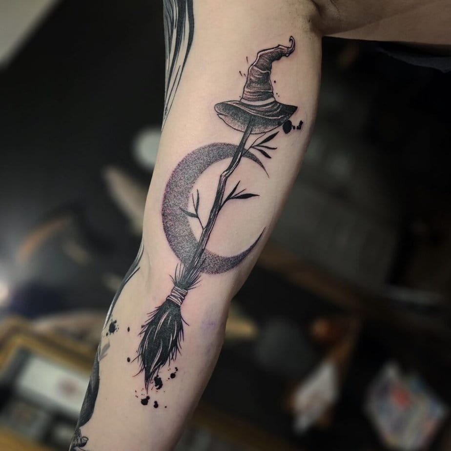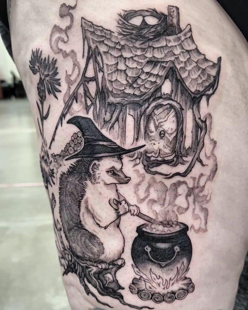 Witch imagery is basically shorthand for resistance. Brooms, hats, moons, crystals — they’re shorthand for a woman who lives by her own rules. Some witchy tattoos are ornate and symbolic: moons, nature, stars, knowledge. Others are cheerfully blunt — a witch, a black cat, flowers, and no apologies. And yes, a little witchy mouse over a cauldron is adorable and still carries the message: power doesn’t always have to look fierce to be real. Sometimes it’s a quiet love of earth magic and ritual.