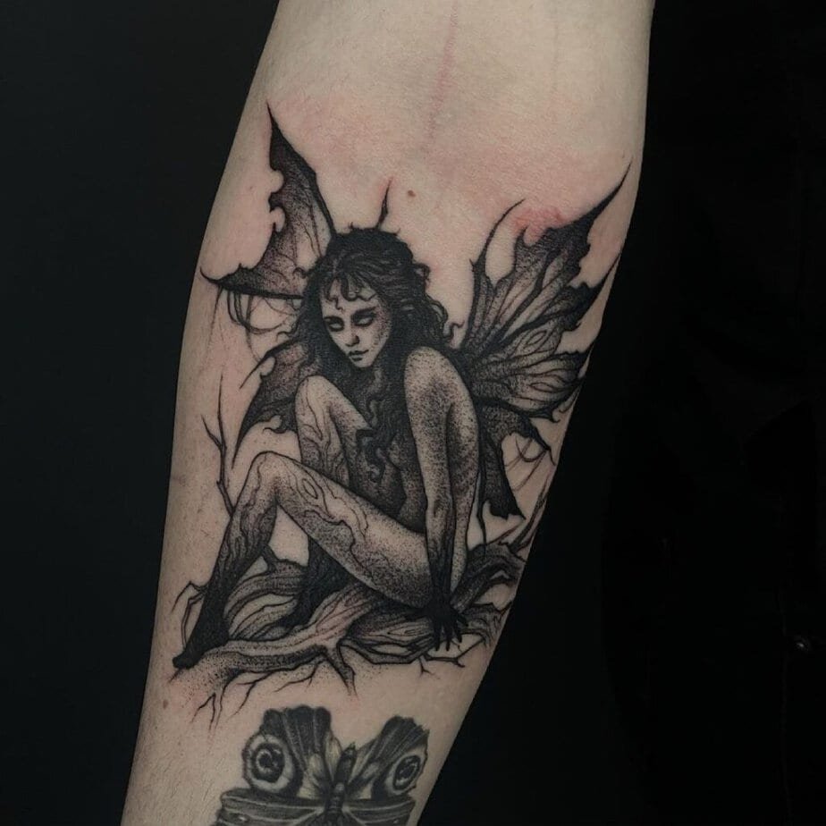 Let’s be real: fairies in kids’ books are cute, but the fae in folklore are a different kind of trouble. They’re mischievous, malevolent, and perfect for dark feminine ink. A creature with delicate wings and an eerie face says so much — beauty that’s not here to comfort you. Then there are the fae pieces loaded with tiny details: webs on wings, mushrooms, moons, scenes that feel like a midnight story you don’t want to interrupt. They’re detailed, elegant, and low-key terrifying in the best way.
