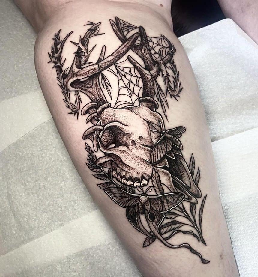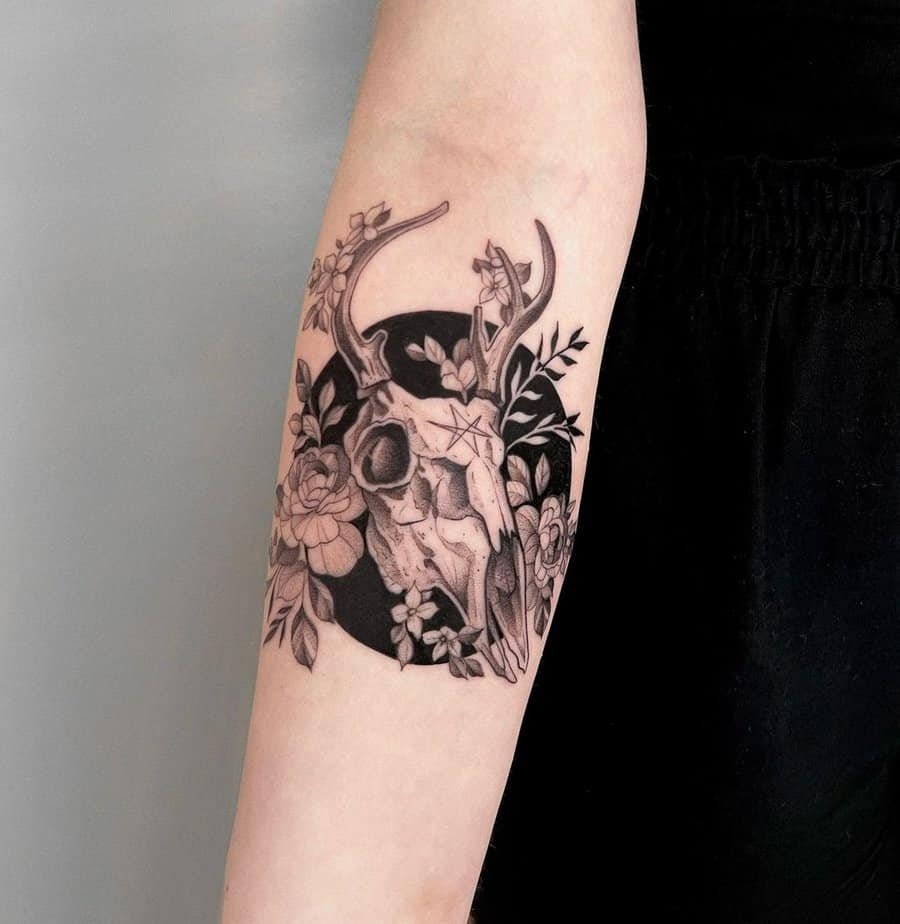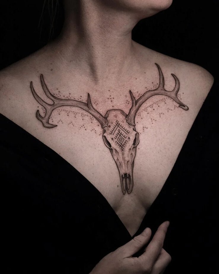 This one leans into the mysterious: symbols and fine details etched onto the skull, dramatic antlers, a chest placement that demands attention. It’s for the person who loves natural forms but also wants a tattoo that feels like it could be part of a ritual or a story you tell by moonlight.