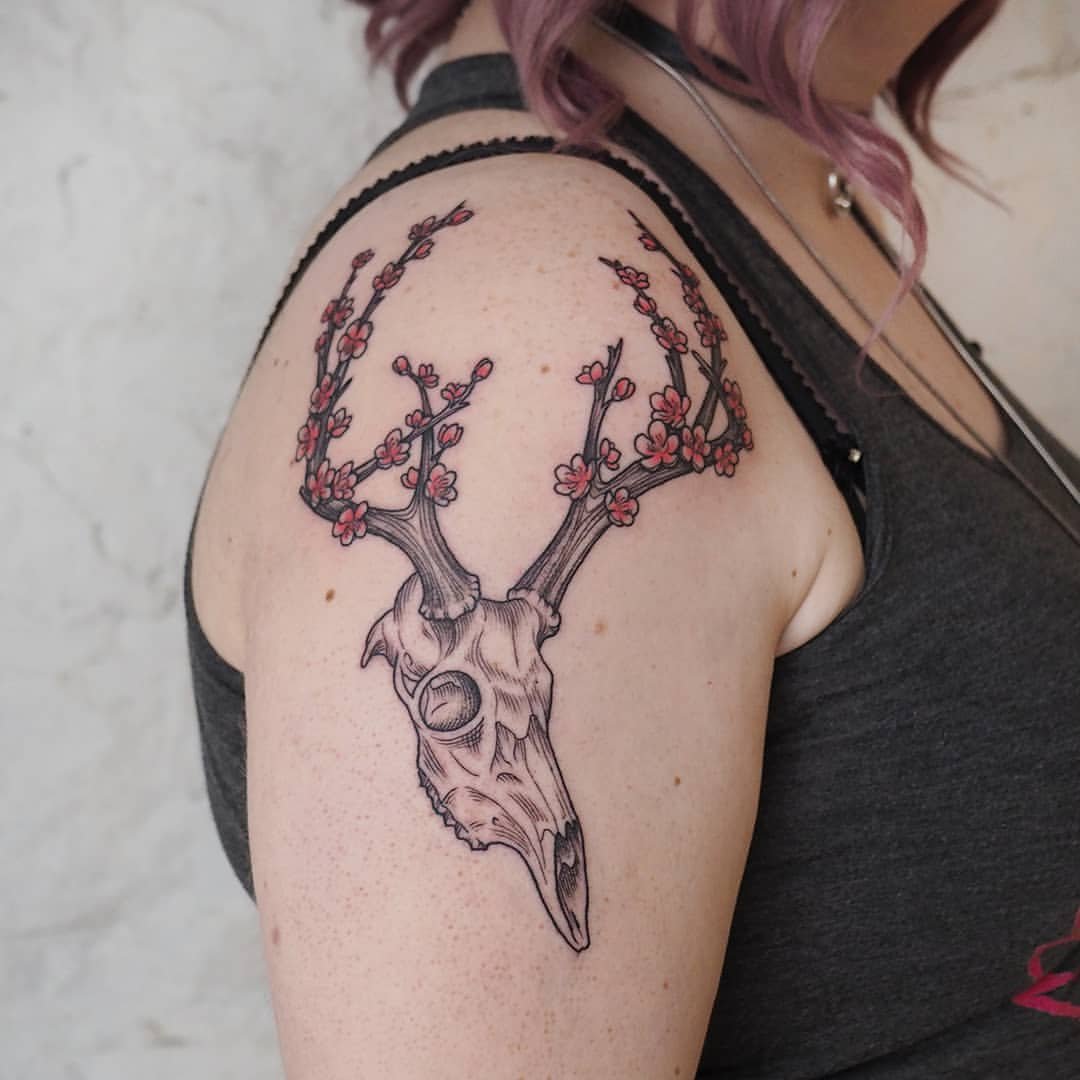 Cherry blossoms unfurling from antlers — honestly, it’s like a haiku on skin. This one is soft and symbolic, a quiet nod to renewal and the strange beauty that rises from endings.