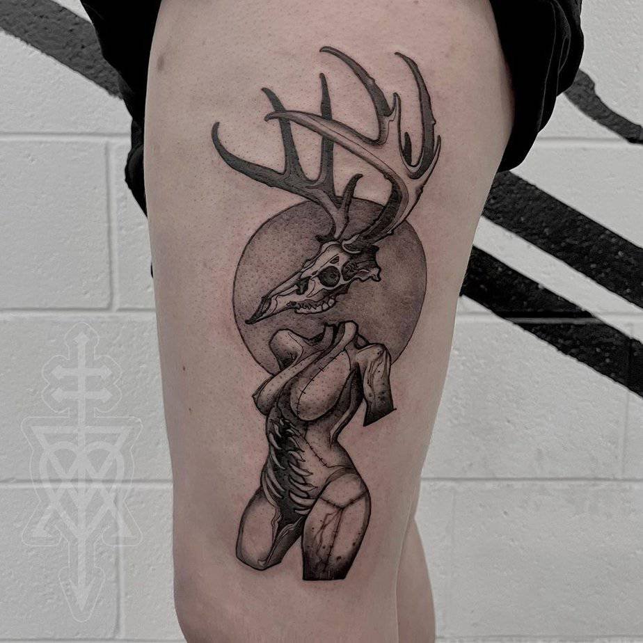 Tucked on the shoulder blade, this design makes a lovely silhouette: detailed skull and antlers that read beautifully with movement. It’s the sweet spot between visible and personal — an elegant piece that catches the eye without being loud.