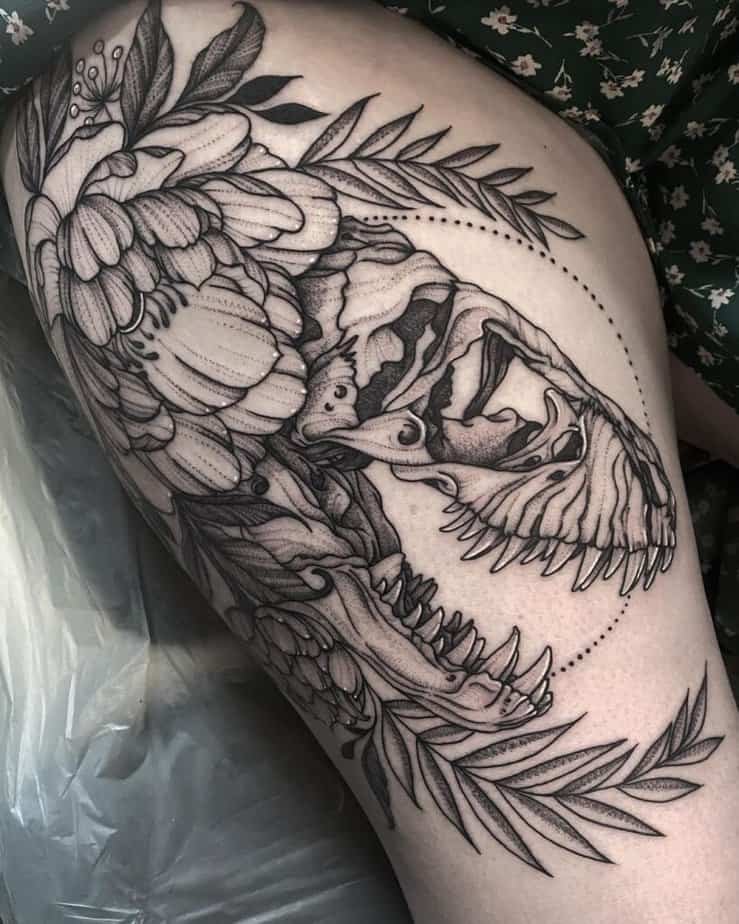 If you love bold linework, skeleton dinos are gorgeous. There’s something satisfying about how the bones can follow the natural movement of your body — like ribs and vertebrae that seem to belong there. One of these shows the ribs perfectly; it’s instantly readable but still stylish. Another leg piece leans into anatomical vibes and makes the skeleton feel like it’s in motion, which is honestly impressive and kind of badass.