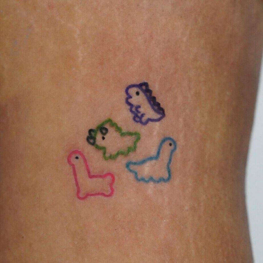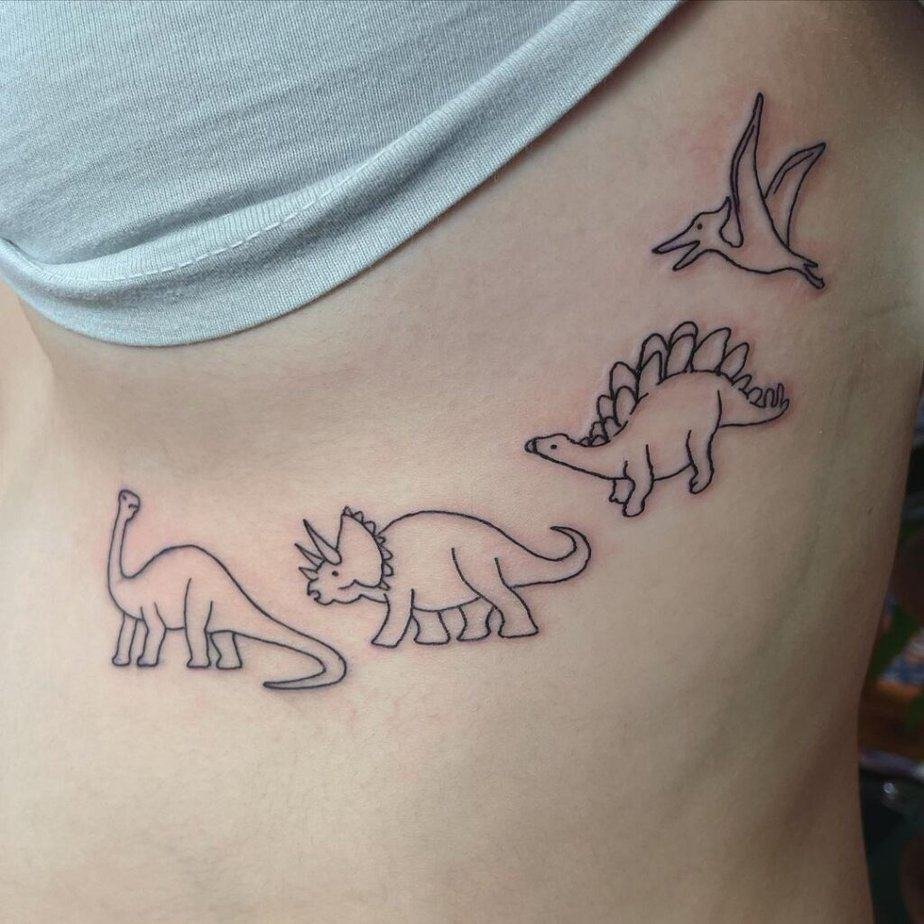 If you’re not ready for a giant commitment, small linework dinos are your soulmate. People are loving tiny, minimalist dinos that sit together like a little parade — delicate, cute, and low drama. One lineup follows the ribs with nothing but outlines, no shading, so the design stays airy and unique. There’s even a version with colored outlines that look adorable and manage to keep saturation across stretch marks — little details like that make me appreciate an artist’s skill.