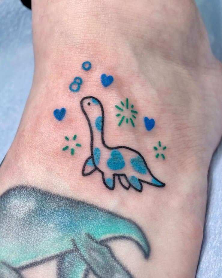 Strength doesn’t have to look scary — it can be tiny, soft, and totally charming. I adore the dino with a little sprout on its head; it reads as gentle and hopeful. Then there’s one with heavy black outlines and red hearts that make it feel like a cartoon come to life — animated energy in ink. And if you’re into ocean vibes, a blue Plesiosaurus covered in hearts and tiny bubbles is whimsical and saturated perfectly. These are the kinds of tattoos that make strangers smile when they catch a glimpse.