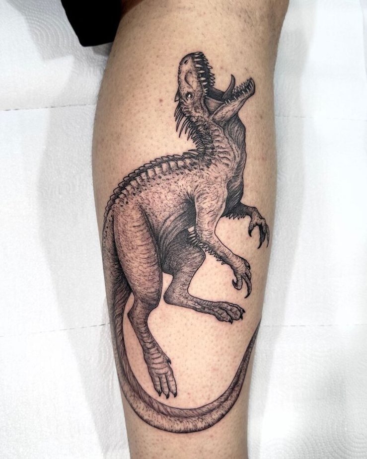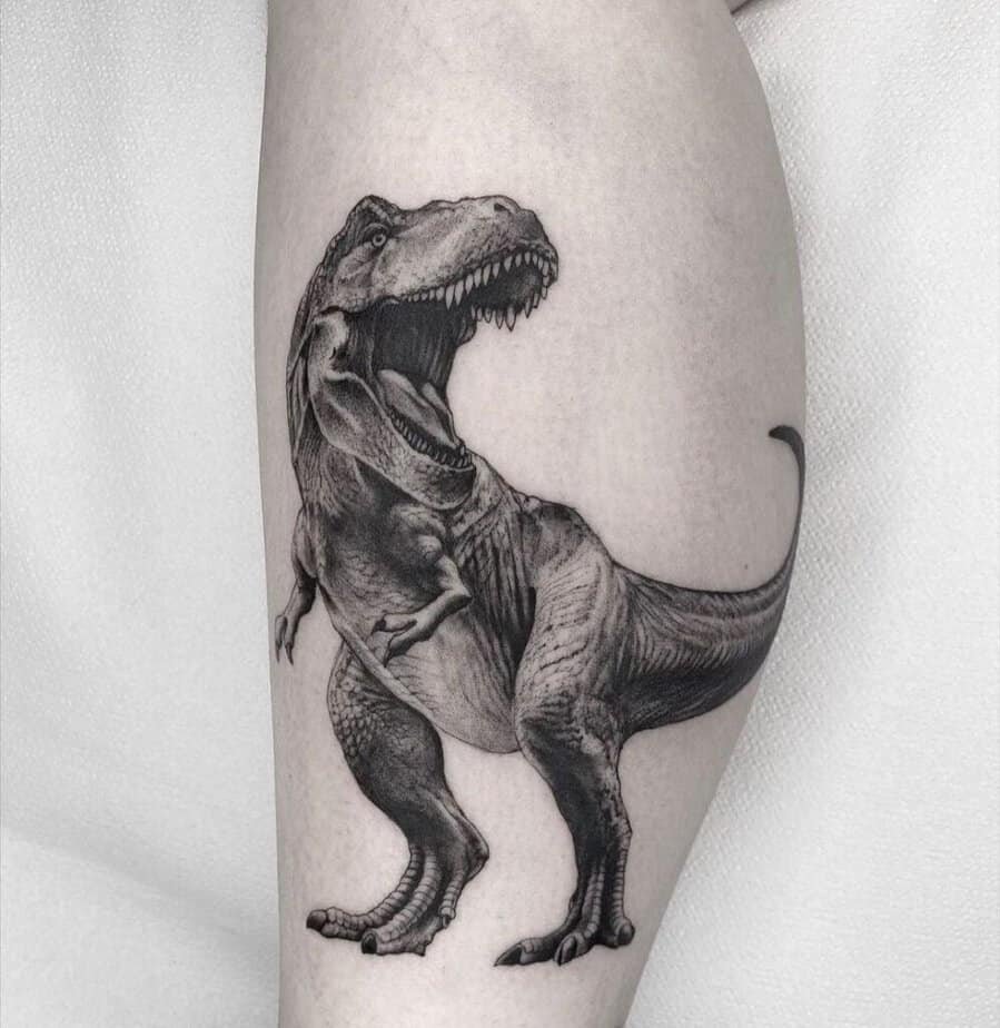 Now for the seriously dramatic stuff: black and gray realism. A Velociraptor done with tight shading can look huge even if the piece itself isn’t massive, because of how the details read. Some pieces favor darker tones and compositions that follow the leg or shoulder, making the dino feel like it’s wrapped around you with an open, snarling mouth. Others are semi-realistic with soft internal tones and no harsh outlines, which makes them feel like they’re emerging from the skin. Then you hit the full T‑Rex realism — tiny shadows, muscle detail, and a presence that really sells the whole "strength" idea.
