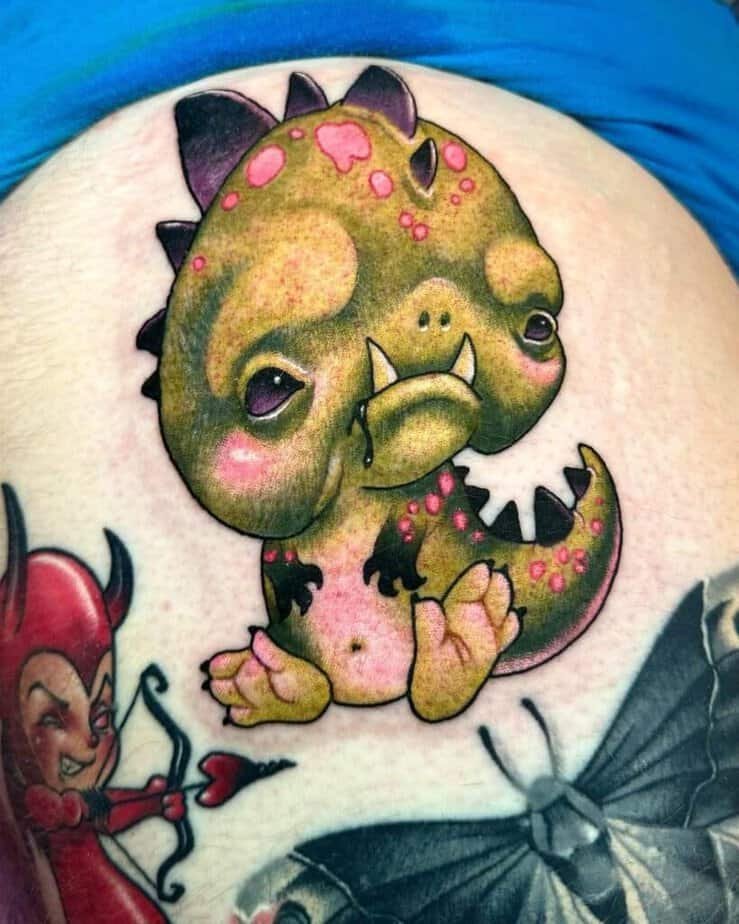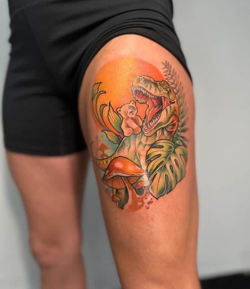 So — would you like a cup of dino? This one is literally a little dinosaur chilling in a teacup, and the detail is wild. Full-color work really sings when the saturation is on point, and even tiny things like those little circles on the dino’s body make it feel playful and handcrafted. Then there are pieces that lean more realistic: not a ton of linework, but rich shadows and color that give the creature life, and cute leaves framing it like it belongs in a painting. You can also let your imagination run absolutely free — I love the one that’s both cute and a little weird, with pink tones flirting with saturated green and an expression that needs almost no outline to read. If warm palettes are your jam, there’s a T‑Rex carrying a teddy with mushrooms and leaves composing a perfect frame. Or if you want personality, there’s that punk dino with a Mohawk, piercings, and an attitude — a great reminder that tattoos can show off your rebellious side.