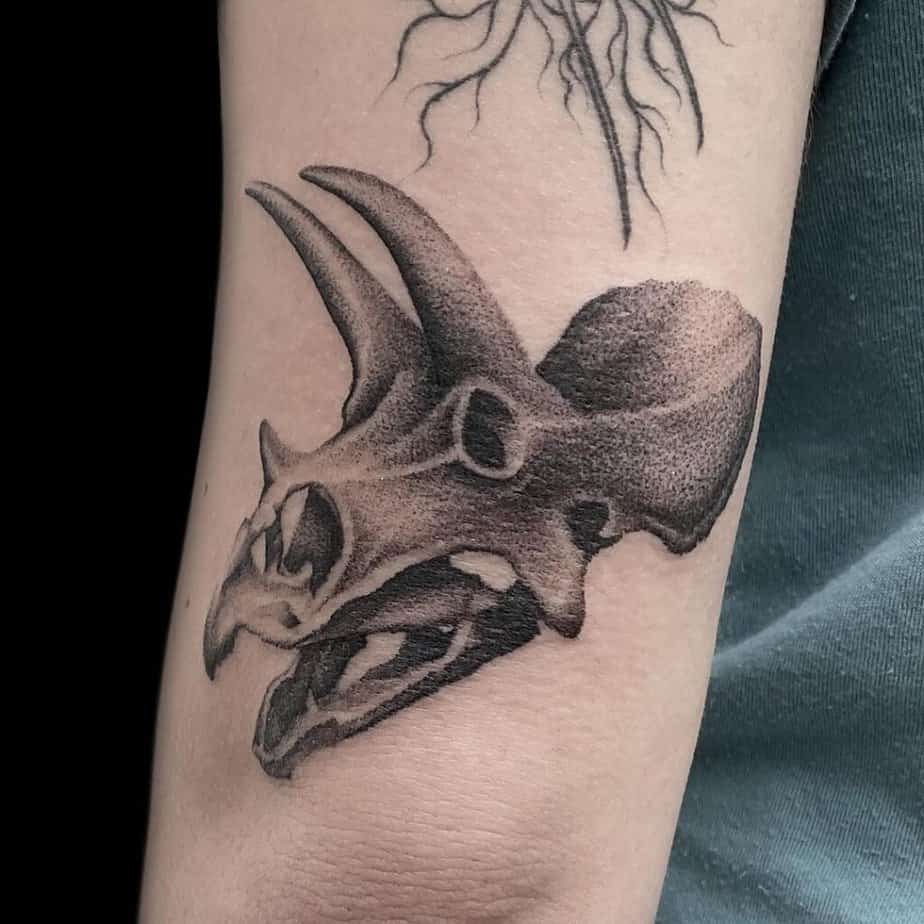 Not into a full skeleton? Cool — skulls are the moody, compact option that still read as fierce. A strong jawline on a skull tattoo keeps that sense of power, and some artists shade them so nicely that they look like charcoal drawings. One Triceratops skull is rendered with tiny dot shading that makes it feel almost like paper art. There’s also a playful placement trick where the tattoo sits near the thumb so the jaw looks like it opens and closes when you move — tiny interactive details like that are so clever. And if you’re bold, there’s a half‑sleeve featuring a giant skull emerging from a huge flower: black and gray, heavy on the shading, and the kind of piece you keep discovering new details in.