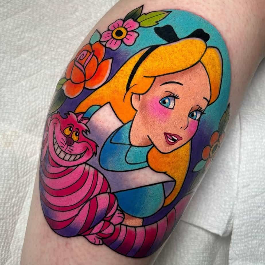 Alice’s curiosity and the Cheshire Cat’s sly grin make for such a fun duo. This colorful tattoo captures their playful push-and-pull: she’s trusting and bold, he’s mischievous but strangely insightful. Together they’re a reminder to question, explore, and laugh along the way.