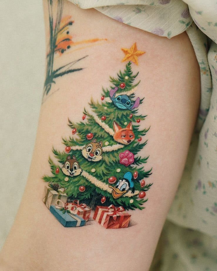 Imagine an upper-arm piece that’s a Christmas tree full of personality: Donald Duck at the base, Chip and Dale nearby, Nick Wilde sneaking in, and Stitch perched just under the star. Presents wait to be opened at the bottom. It’s playful and cozy — the kind of tattoo that reads like a warm holiday snap from childhood.