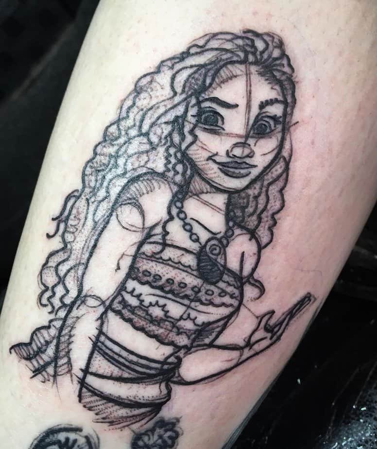 A sketch-style Moana with flowing curls and her grandmother’s necklace — it’s beautiful and rooted in Polynesian inspiration. This one reads like a little pep talk on your skin: be brave, believe in yourself, and keep moving forward.