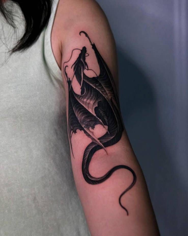 This one leans into the classic dragon vibe: a roaring head, sweeping curves, and scales that are detailed to perfection. It’s the kind of tattoo that makes you feel fierce just looking at it — equal parts power and finesse.