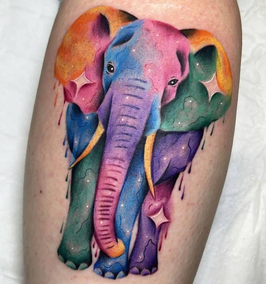 If black-and-gray feels too safe, color brings everything to life. This vibrant elephant is joyful and lively — a celebration of brightness and personality.