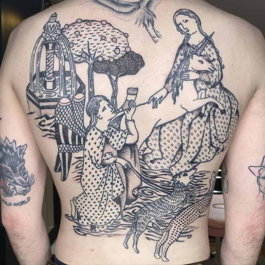 This back piece looks like it walked straight out of an illuminated manuscript: a unicorn being held tenderly, an angelic figure leading dogs, and a decorative fountain setting the scene. It’s whimsical, medieval, and utterly romantic — a tattoo for anyone who loves myth, friendship, and a little fantasy woven into everyday life.