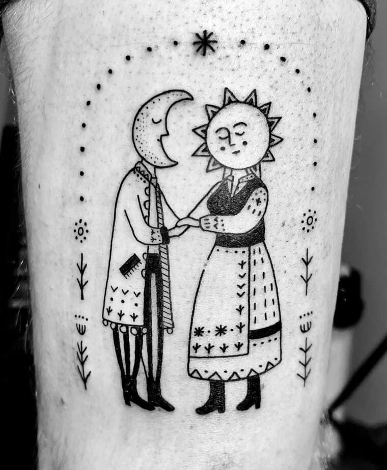 A sun and moon personified, wearing folklore clothes and holding hands — can you even? This one feels like a little poem about balance. Flowers around them soften the scene, making it gentle instead of dramatic. It’s the kind of design that whispers: life has light and dark, and both are beautiful. If you want symbolism without being heavy-handed, this captures it: duality, harmony, and a peaceful coming together.