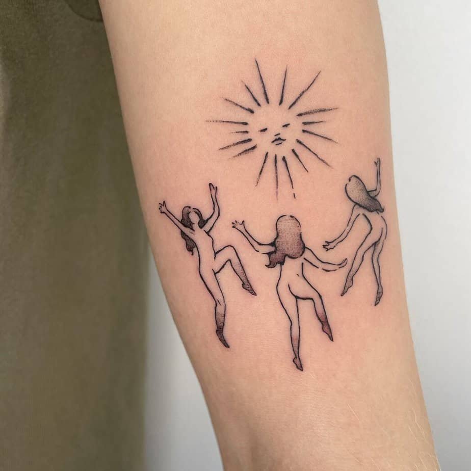 This upper arm piece of three women dancing beneath a smiling sun just radiates community and freedom. Their nudity isn’t about shock — it’s about honesty and being in tune with the earth, like a soulful celebration of womanhood. It reads like vulnerability turned into strength: first there’s the ritual feel of a sun dance, then the gratitude and cyclical rhythms of life, and finally that warm sense of togetherness. It’s tender, spiritual, and a little fierce.