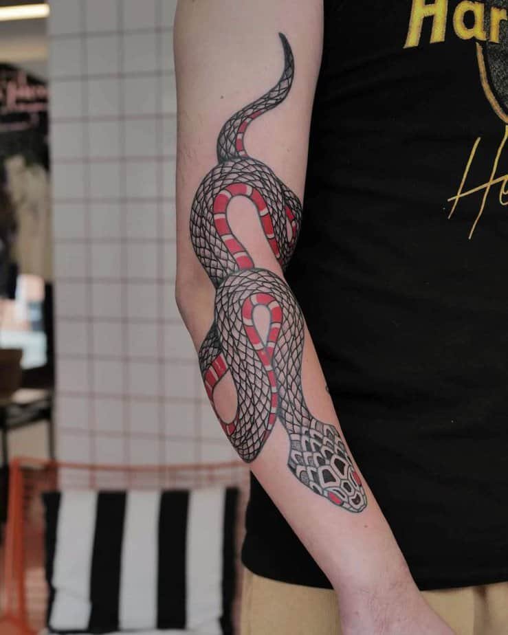 This snake curls down the arm like it owns the place — bold black outlines, pops of red scales, and a pattern that keeps pulling your eye along. It’s gorgeous, sure, but it’s also a little pep talk you can wear: remember that shedding old skin thing? That’s the vibe here — transformation, rebirth, getting back up feeling brighter and stronger.