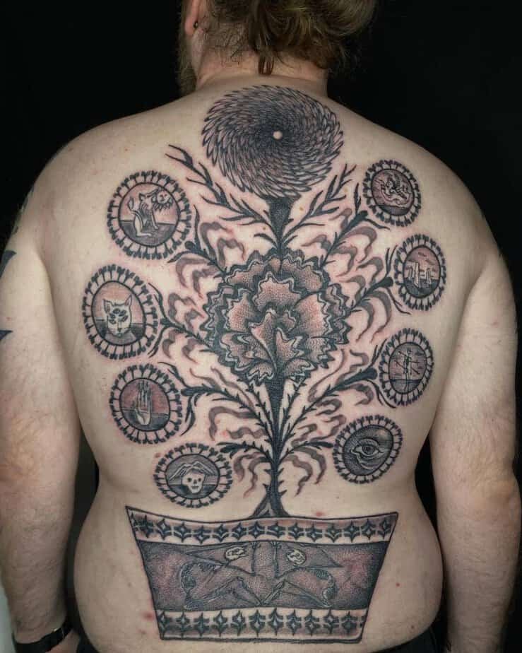 This sprawling back tattoo is one of those pieces where you could spend ages tracing the details. At its heart is a tree of life, but around it are little symbols — an eye watching, a hand reaching — like tiny chapter headings in someone’s life story. It feels connected and mysterious at the same time, the kind of tattoo that grows with you every time you look at it.