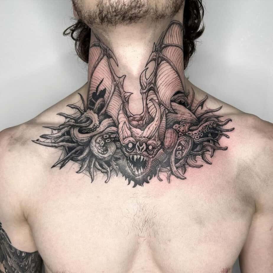 This one is for people who want to lean into the darker, stranger side of tattooing. It’s theatrical, weird, and absolutely unforgettable — perfect if you want your neck art to be a conversation starter.