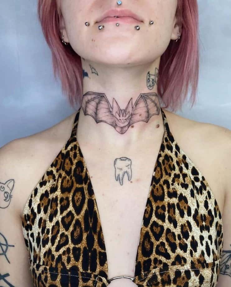 Real talk: butterfly tattoos never get old. They scream transformation in a gentle way and look gorgeous centered on the throat. If you want something symbolic but pretty, this is a fail-safe pick.
