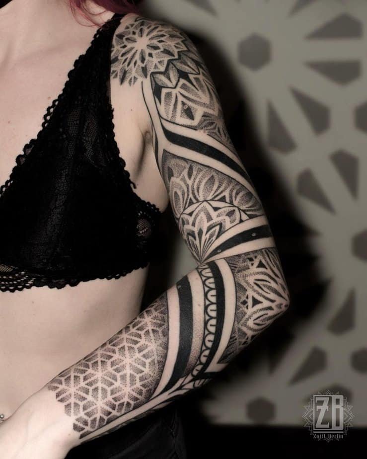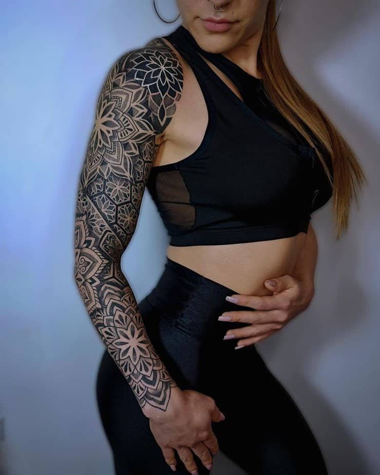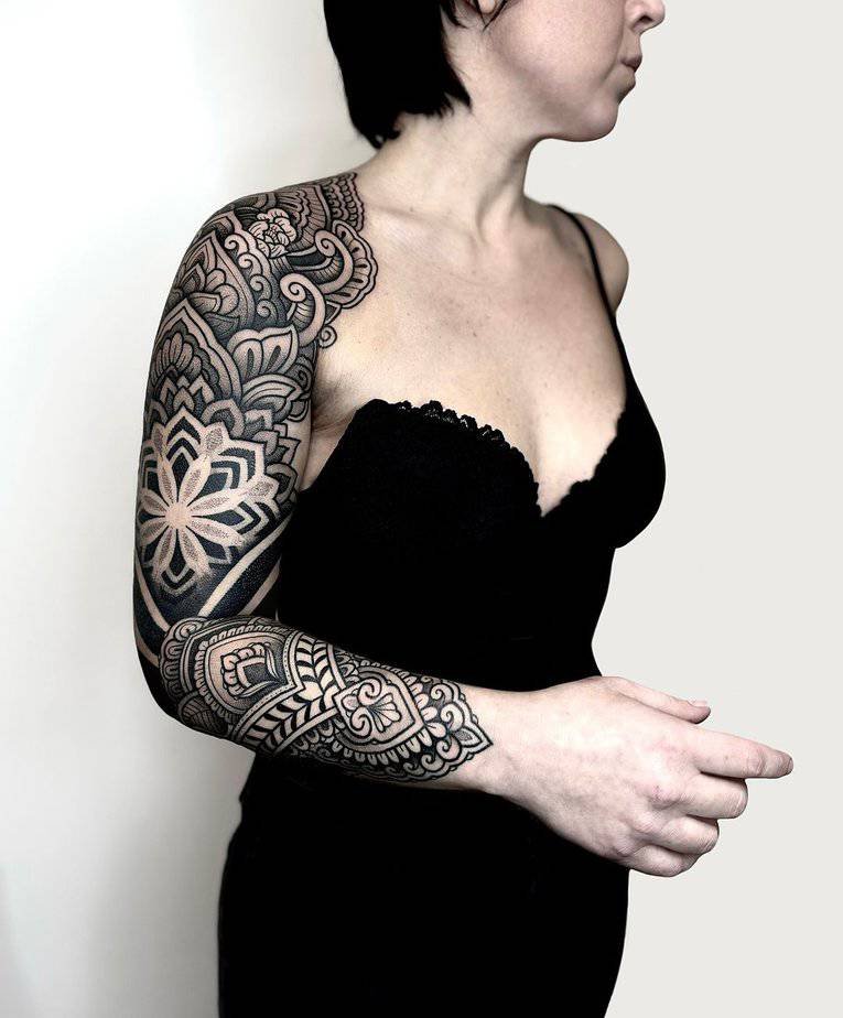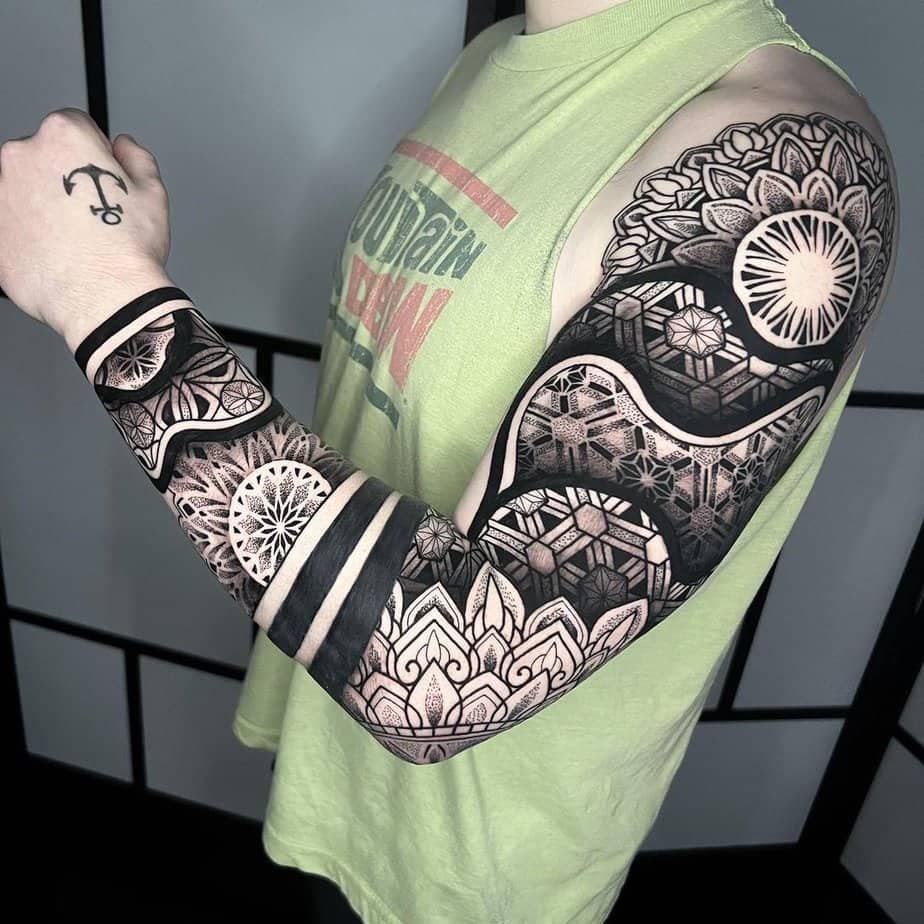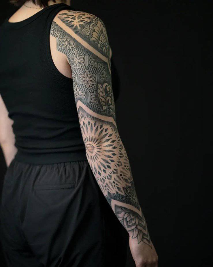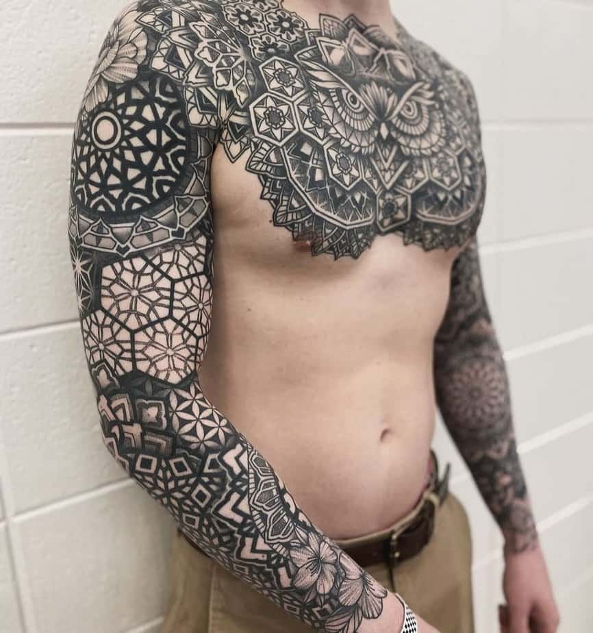 Why stop at the arm? Extending the design across the chest creates a bold, expansive canvas for pattern work. It’s dramatic in the best way — intricate, commanding, and endlessly detailed.