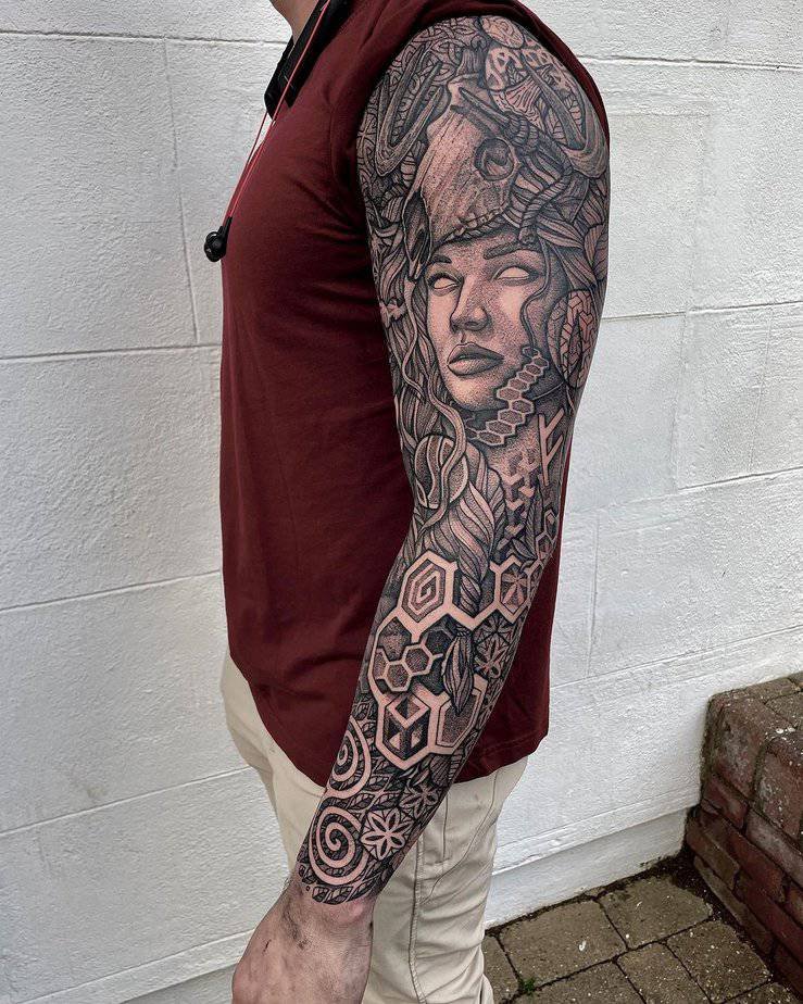 This sleeve reads like a story: geometry woven together with a mythological figure so the piece feels narrative and lived-in. It’s perfect if you want your tattoo to look like it has a backstory — art and history wrapped into one wearable tale.