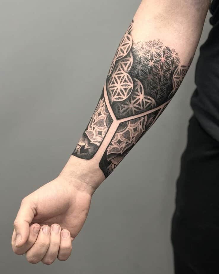 This one borrows from mandala tradition: symmetry, balance, and that calming, meditative vibe. The intricate elements swirl and repeat, creating a rhythm that feels almost like a personal meditation painted on your arm. It’s beautiful and quietly grounding.