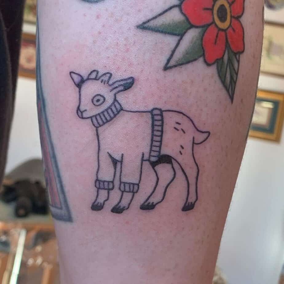 Not everything has to be menacing — goats can be downright adorable. Pastel palettes, dotted techniques, and soft outlines turn them into cozy little pieces: a goofy goat in a sweater (yes please), a baby kid rendered with light texture and big eyes, or a curly-haired, almost luxurious goat with delicate blue specks and a sunny pop of yellow. There are simple, graphic versions too — minimal lines, a couple of blackout shapes for horns or legs — all of which feel playful rather than symbolic. A baby goat on the thigh? Instant heart-melter.